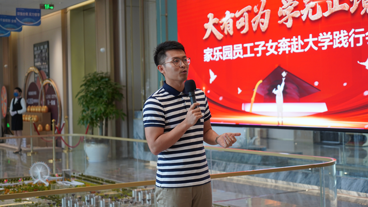 學子們坐在售樓部裝滿書籍的階梯狀空間內,首先觀看了激動人心的人生夢想和國家發展視頻,主持人崔國銘介紹了家樂園發展史,當學子們看到自己父母為之奮斗的企業發展的規模如此龐大,眼神里流露出驕傲與渴望。在分享環節,首先是四名優秀的學生代表從不同角度分享了自己勵志的學習經歷,自己對大學的期望和規劃,并各自送給即將步入大學的同齡人一句箴言,讓大家對大學生活都有了進一步的思考。其后,由目前正在大學就讀的員工子女代表張秋雯、邢宇哲給大家分享了自己在大學學習、生活的經驗,他們作為學長學姐,對大學生活有了親身的體驗,給各位學子們提出了真實而中肯的建議,相信學子們一定會少走許多彎路。